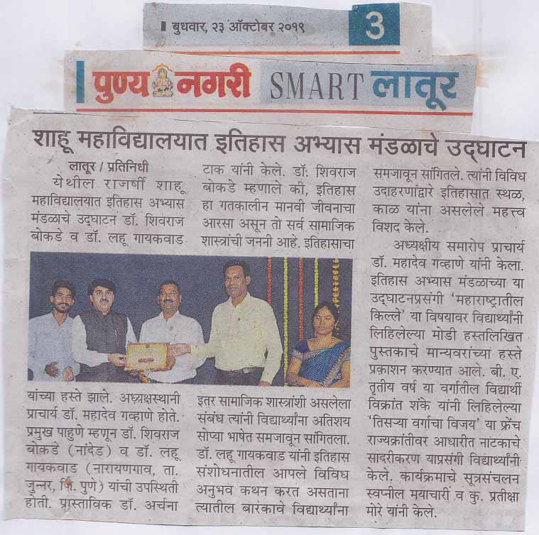 Department of History is one of the oldest Department of our college. The Department of History was established in 1970. It offers History as an Optional Subject at U.G. level. Our Department undertakes many important activities like History Association, Guest Lectures, Educational Study Tours, Different Competitions (Quiz, Rangoli, Recipe, General Knowledge, Making Historical Monument Model, One Minute Show, Modi Transcript, Poater, Drawing, Fort Making etc.), Modi Script training workshop, Historical Drama Presentation, Heritage Walk etc. To develop the student’s interest in History, the History Association has been working in the college for many years. The department is most thankful to the scholarly personalities like Mr. Vidyadhar Kande Patil, Mr. Atul Deulgaonkar, Dr. Anil Kathare, Mr. Pradip Solunke, Miss Deepali Ghadage, Dr. Suresh Waghmare, Dr. Baburao Bikkad, Principal Namdkumar Nikam, Dr. Prashant Deshmukh, Dr. Shivraj Bokade, Dr. Sanjay Waghmare, Dr. Anil Singare, Dr. Deepak Gaikwad, Dr. Sadashiv Dande, Mr. Bhujang Bobade, Dr. Lahu Gaikwad, Dr. Sahebrao Gathal, Dr. Kamaji Dak for their visit to the department. To increase the interest of the students in this subject, a Educational Study Tours were arranged every year. The department has visited a number of historical places in Maharashtra comprising Ter, Tuljapur, Verul, Ajintha, Paithan, Nashik, Pune, Raigad, Mahad, Kolhapur, Pratapgad, Ahmednagar, Junnar, Ozar, Lenyadri, Naneghat, Aurangabad, Kharosa Caves etc. History department had organized a Modi Script Training Workshop We guided our students about Modi Script in our college. In the Training workshop students were given information of Vowels, consonants, alphabets, chronology system, Arabic months, name of days etc. in Modi Script. Students could learn reading and writing in Modi Script. The Department has a reference Departmental Library. 500 hundred books in this Library. Books are issued to the students.