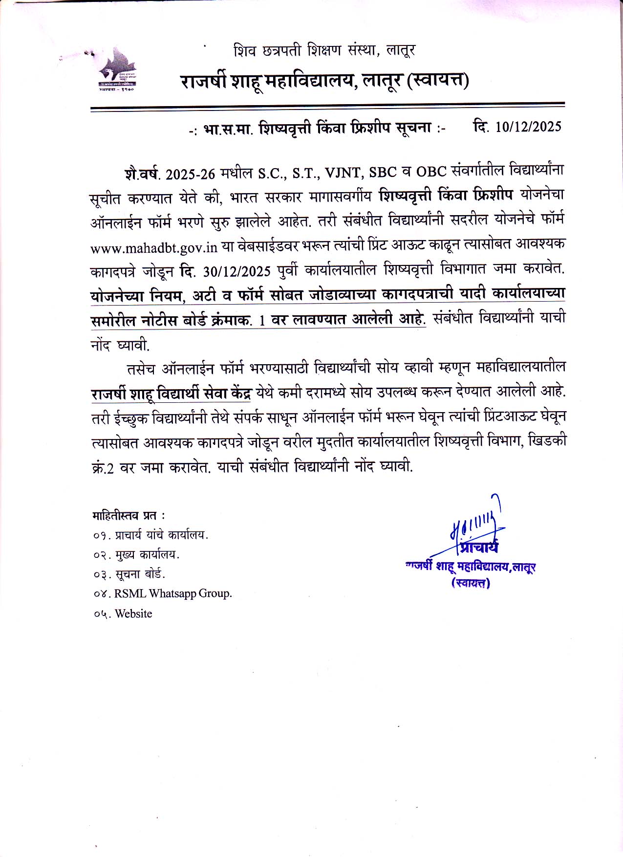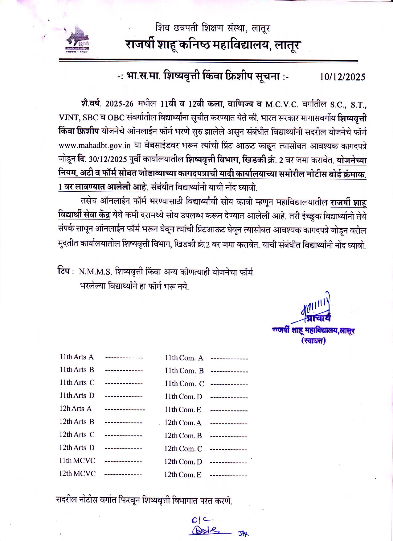 Last Updated on 10/12/2025 Notice for 11th, 12th Arts/Commerce/MCVC Scholarship / Freeship Students