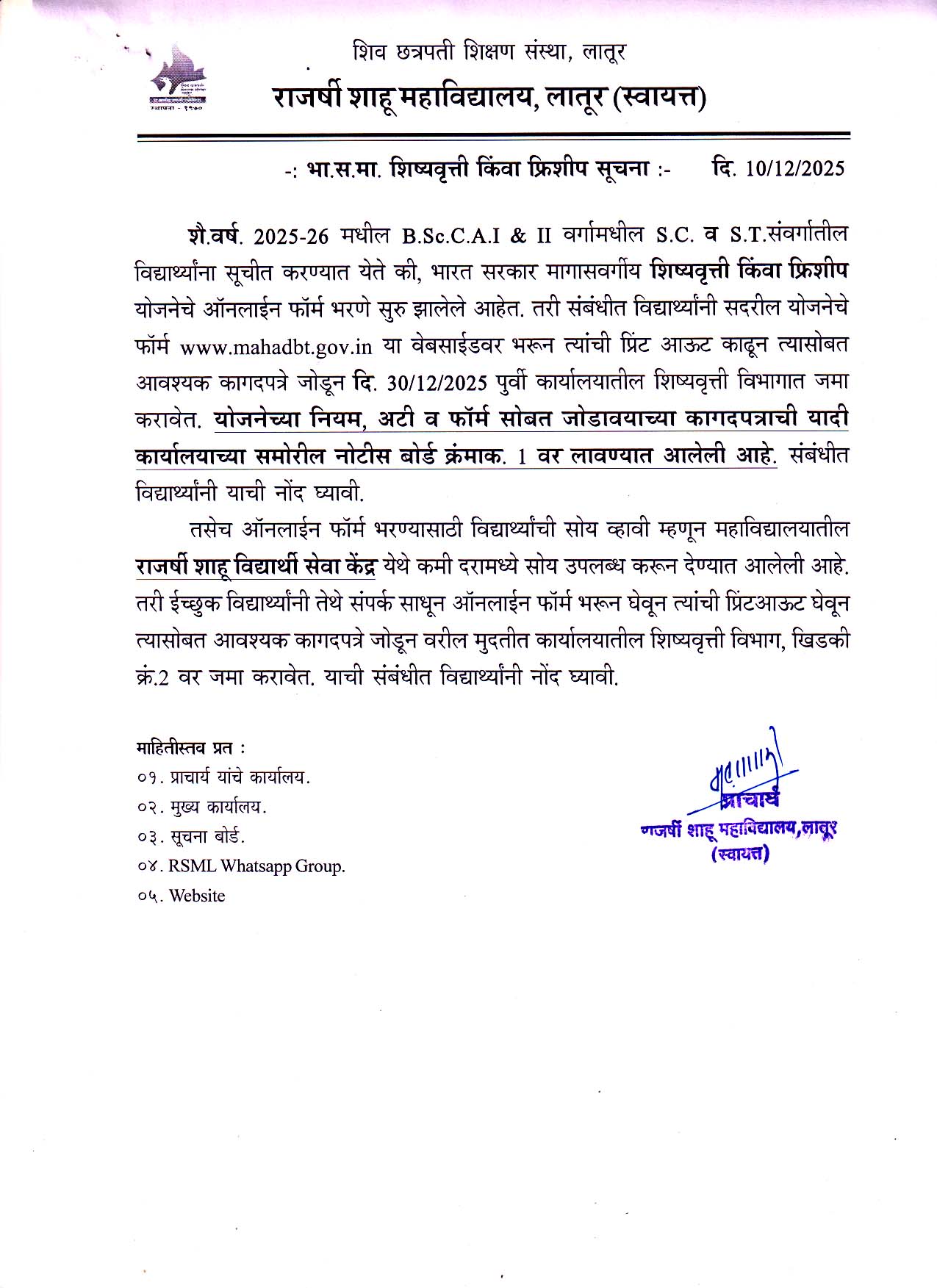 Last Updated on 10/12/2025 Scholarship / Freeship Notice for B.Sc.CA I & II Year Students